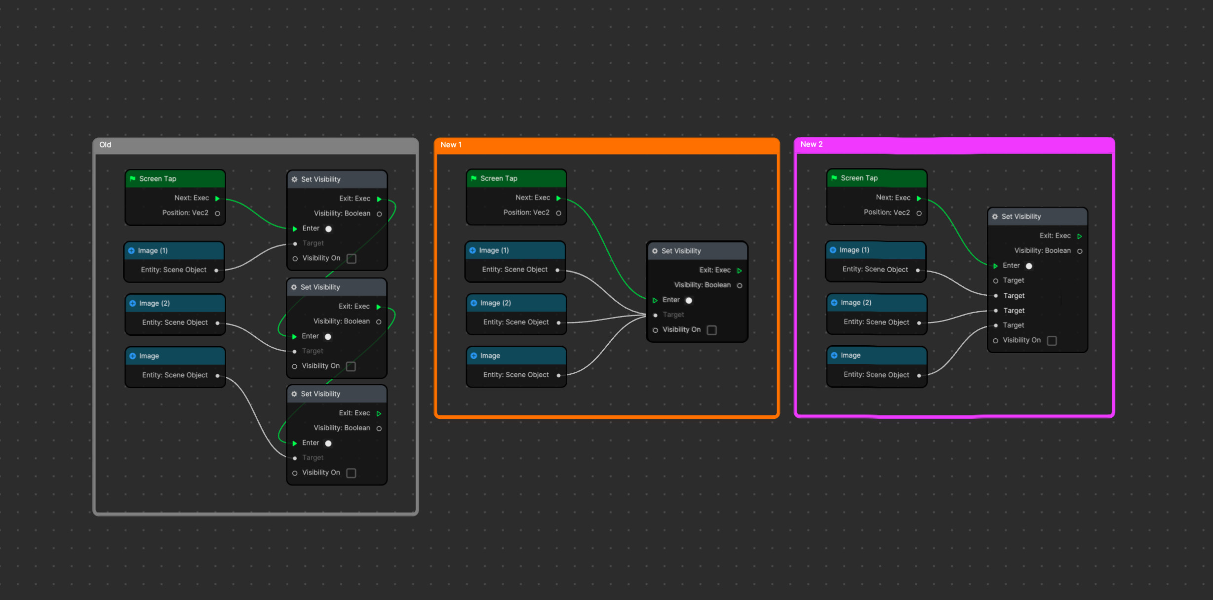 Here is an example for Multiple input jacks at the same time. Set Visibility to multiple Objects at the same time. It will save time as well as limit lag when there are too many Notes